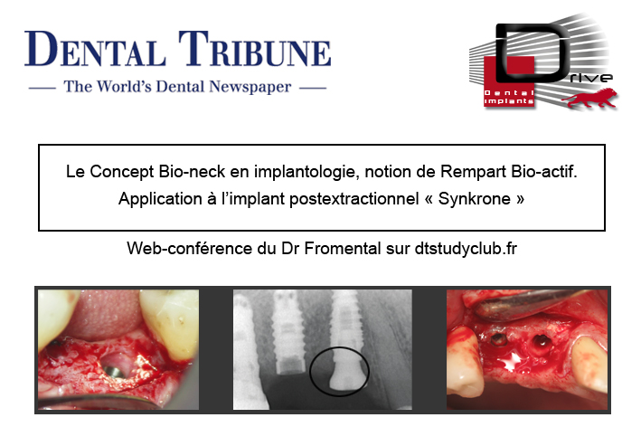 Web-conférence du Dr Fromental sur le site DtStudyclub.fr : Le Concept Bio-neck en implantologie, notion de Rempart Bio-actif. Application à l’implant postextractionnel « Synkrone » Lien : http://dental-tribune.com/le_concept_bio-neck.html
