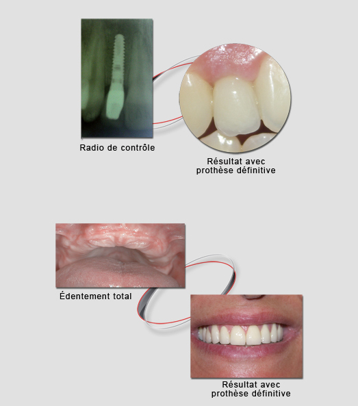 Remplacement d'une dent cassé ou manquante Remplacement de plusieurs dents par une solution fice (bridge) Stabilisation d'un appareil dentaire amovible (partiel ou complet) English